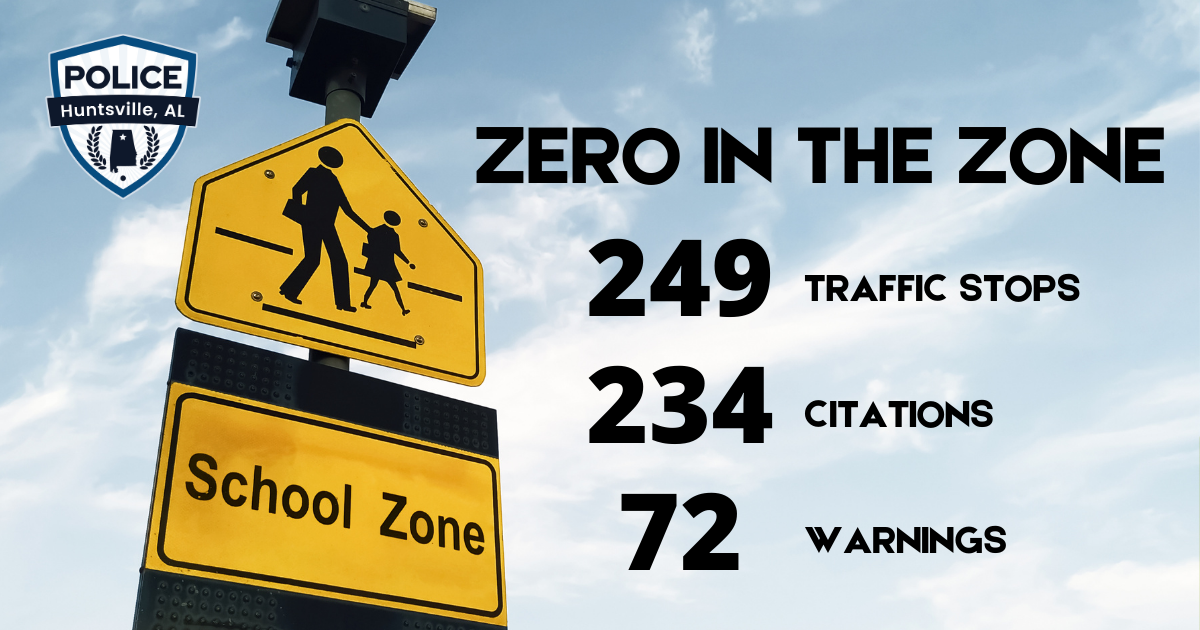 The Huntsville Police Department’s (HPD) Zero in the Zone initiative, launched to boost school zone enforcement during the first month of the 2025-2026 school year, led to a significant increase in traffic stops and more than twice the number of citations compared to last year.