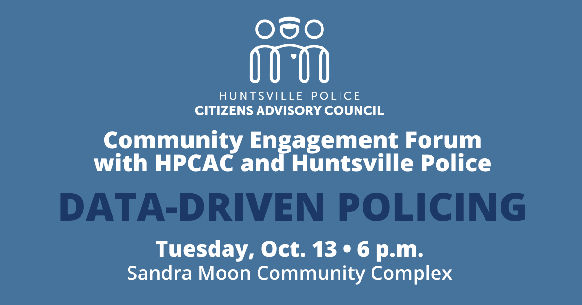Come learn with the Huntsville Police Citizens Foundation (HPCAC) and the Huntsville Police Department how data helps guide policing, improve safety and allocate resources effectively. Ask questions, see the strategies in action and get involved!