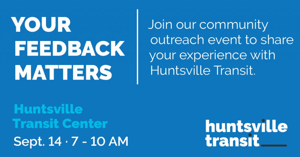 Huntsville Transit will host a community outreach meeting from 7-10 a.m. Wednesday, Sept. 14, at the Huntsville Transit Center, 500-B Church St., Huntsville. Transit officials want to hear from patrons or community members who have suggestions about operations. The City will use comments to help shape a strategic plan designed to guide future service improvements. Click here to learn more.
