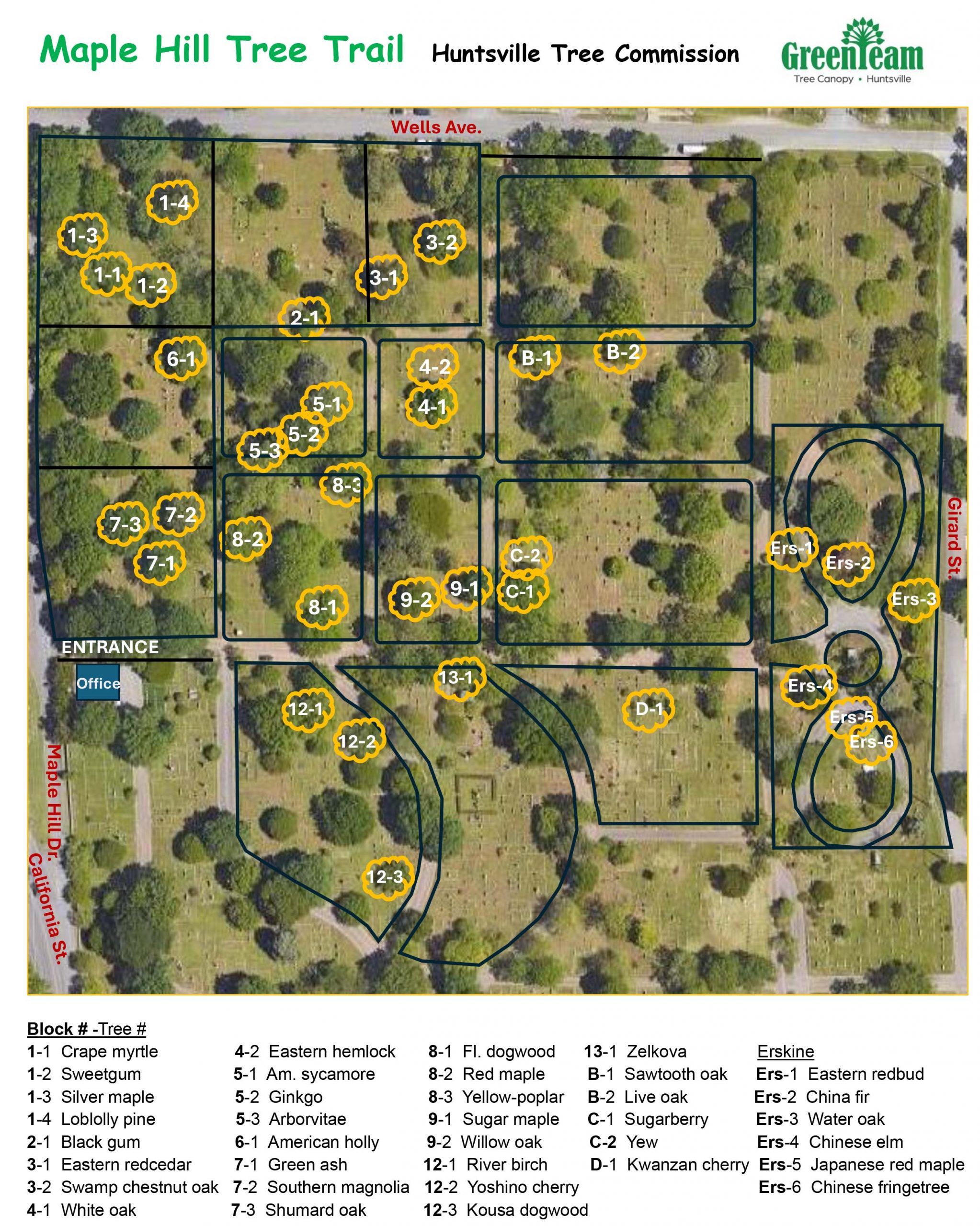 The Huntsville Tree Commission in collaboration with the City’s Green Team, Cemeteries and GIS departments, have identified and mapped more than 35 species of trees in the historic area of Maple Hill Cemetery. Each tree is tagged with its common and scientific names. Visit the Maple Hill Tree Trail App or download the Maple Hill Tree Trail Booklet to view photos and descriptions of each species’ leaves, flowers, fruit, twigs, bark, and fall colors.