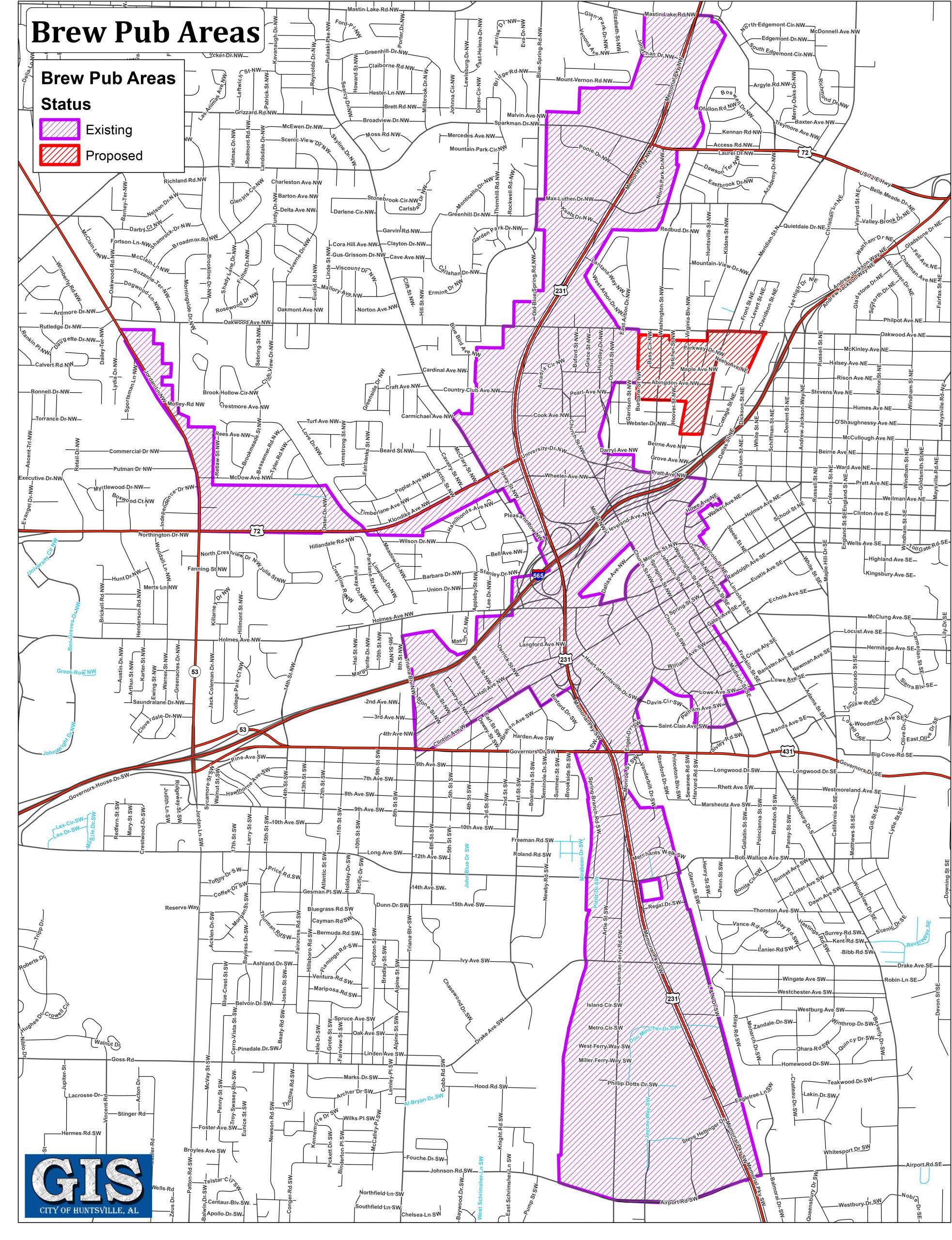 The City of Huntsville first mapped designated areas for brewpubs in 2013, following new state legislation that removed many of the barriers for operation. Huntsville zoning regulations for brewpubs and larger brewery operations follow commercial and industrial zones where bars are already permitted.