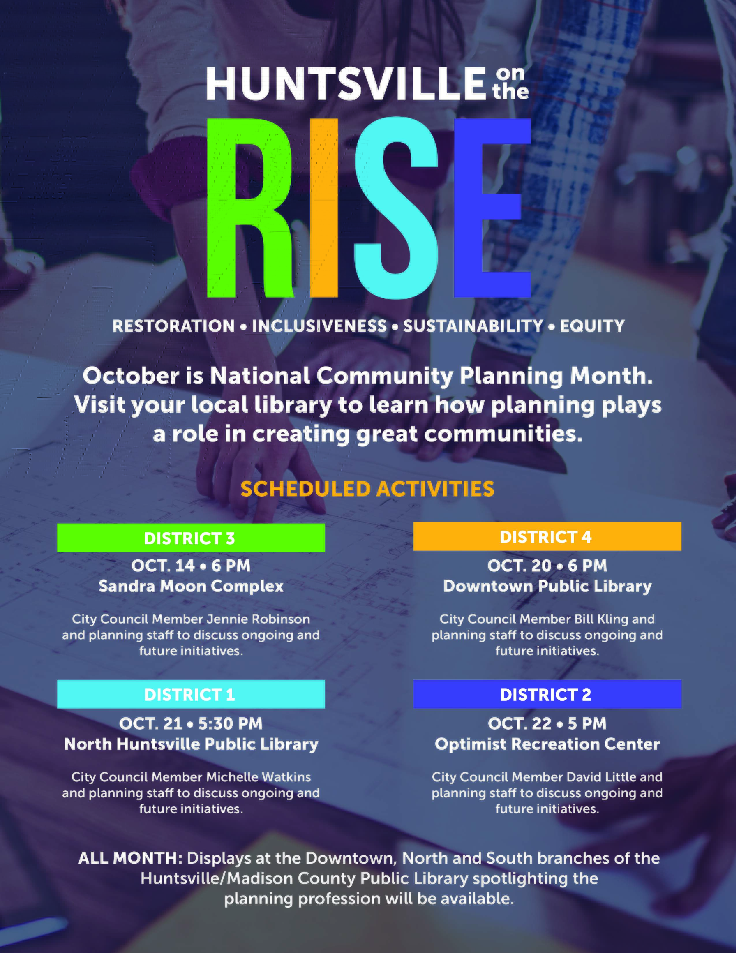 This is the fourth year Huntsville has commemorated Community Planning Month with the theme of “Huntsville on the R.I.S.E.” The emphasis this year is on equity as the city supports efforts to create a sustainable urban development that revitalizes and strengthens the community, and ensures all residents participate in and benefit from the economic growth and development decisions that guides the community.