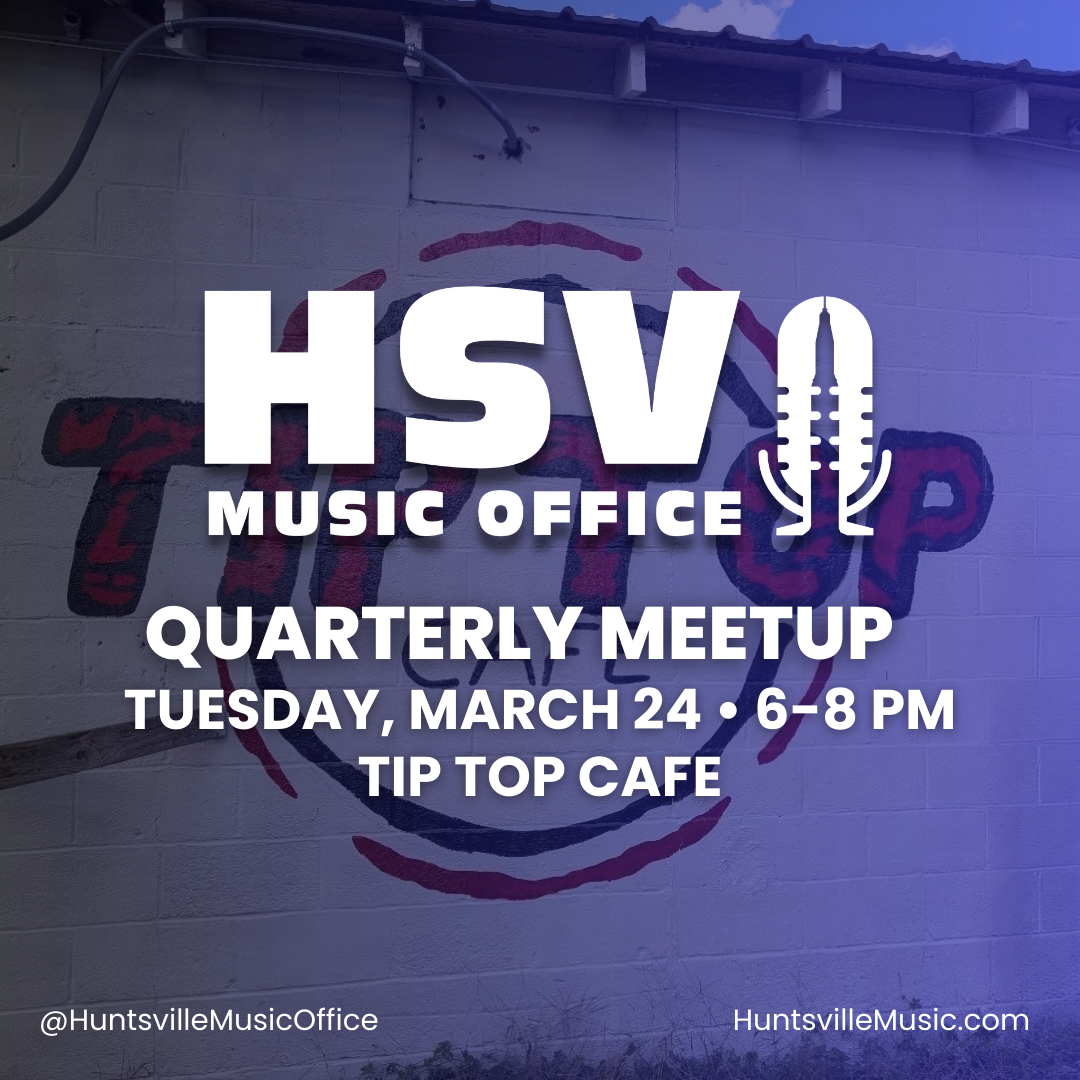 The Huntsville Music Office is hosting its first Quarterly Music Meetup of 2026 on Tuesday, March 24, from 6-8 p.m. at the recently reopened Tip Top Cafe, located at 125 Maple Avenue NW.