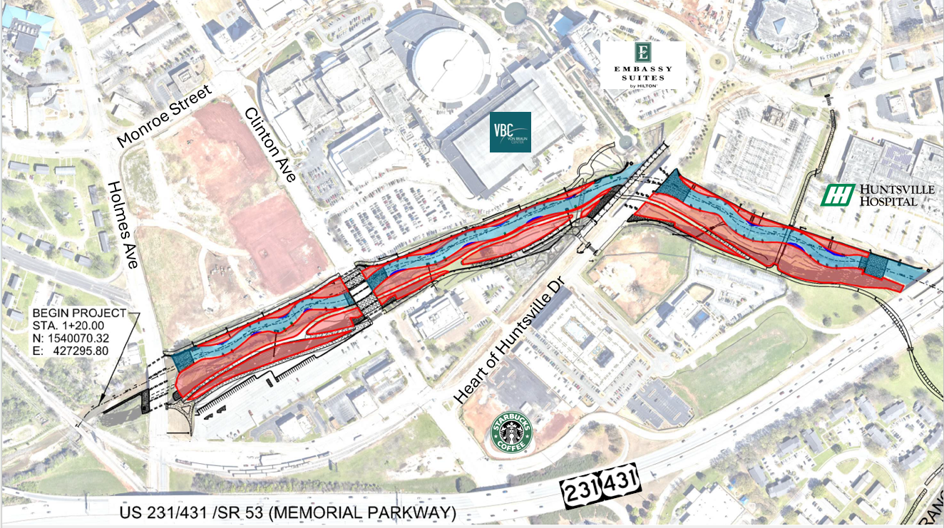 The scope of the contract includes improvements to approximately 3,200 linear feet of Pinhook Creek for flood mitigation from Holmes Avenue to Memorial Parkway. The project includes about 100,000 cubic yards of excavation and about 90,000 square feet of retaining walls.